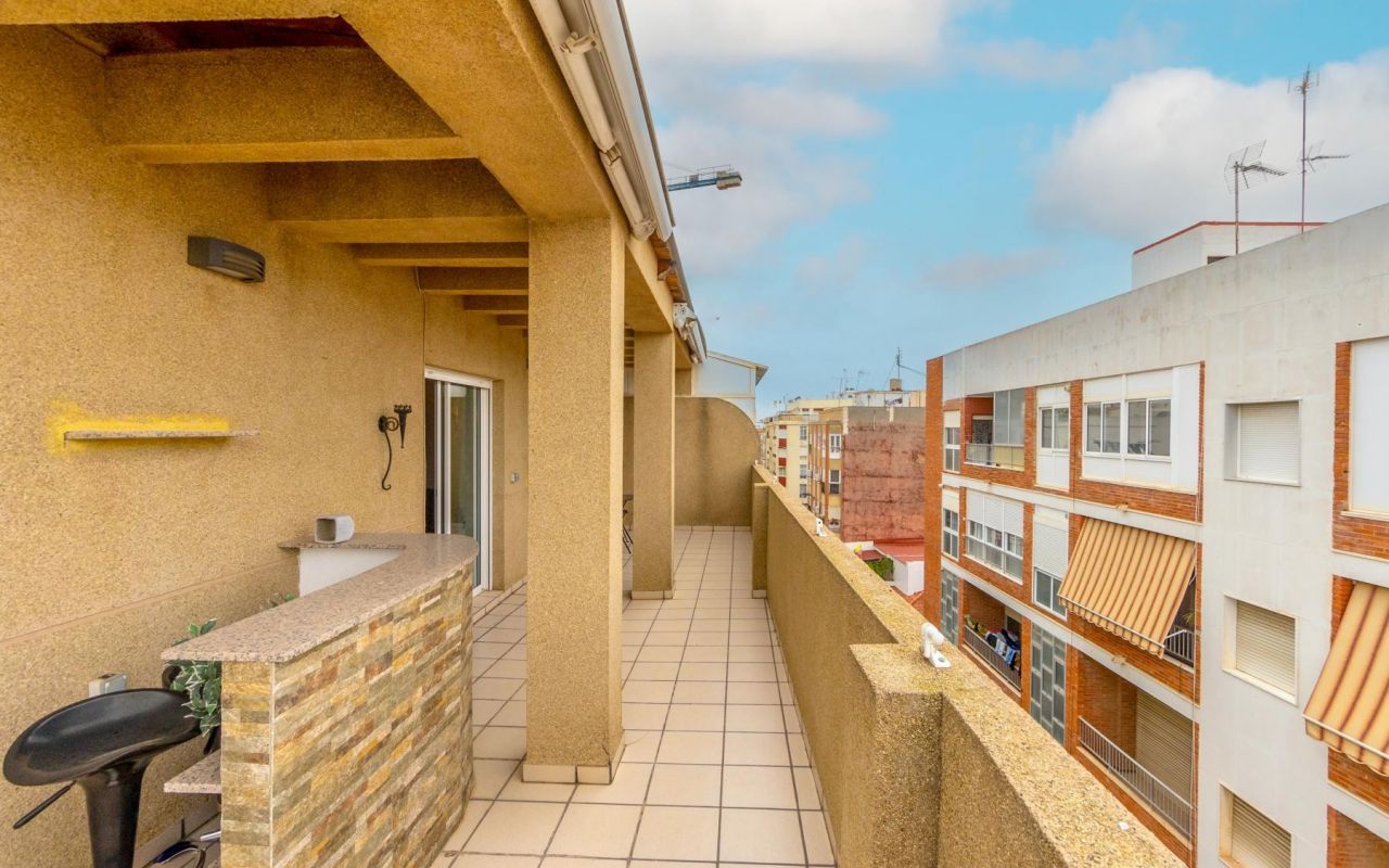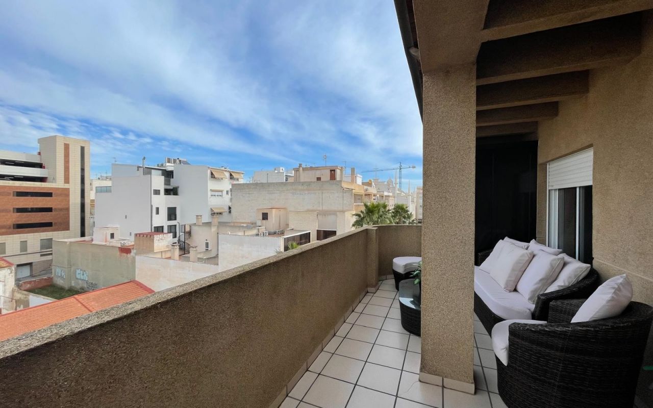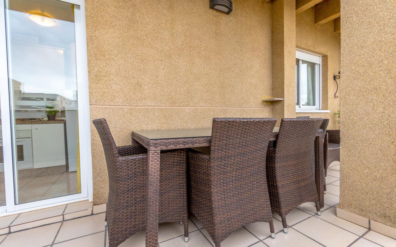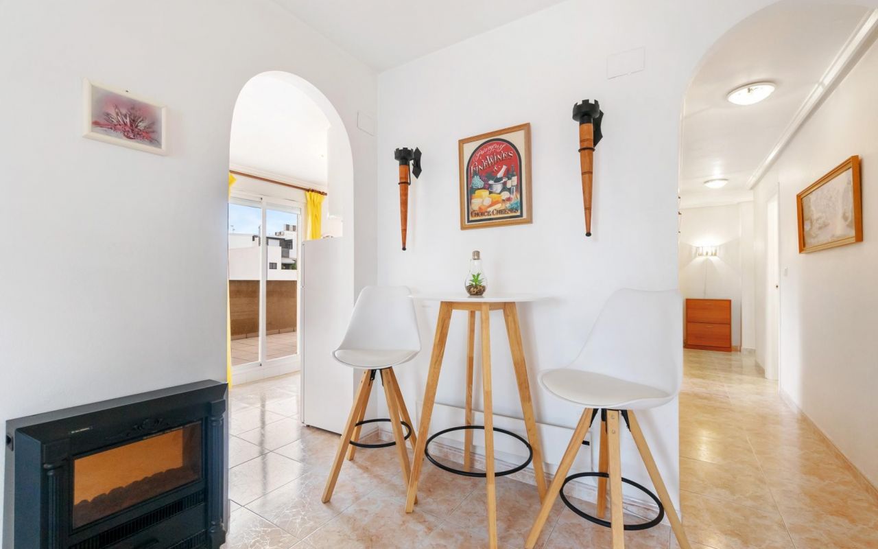 Koselig toppleilighet med 3 soverom, hovedsoverommet med eget bad og direkte tilgang til terrassen, pluss et ekstra bad. Stuen er romslig og kjøkkenet er uavhengig, begge med tilgang til en spektakulær hjørneterrasse, perfekt for utendørs frokoster, avslappende øyeblikk eller familiesammenkomster. Dette hjemmet vender mot sør, og er varmt og solrikt hele året. Boligen selges møblert og utstyrt med hvitevarer, klar til å flytte inn.