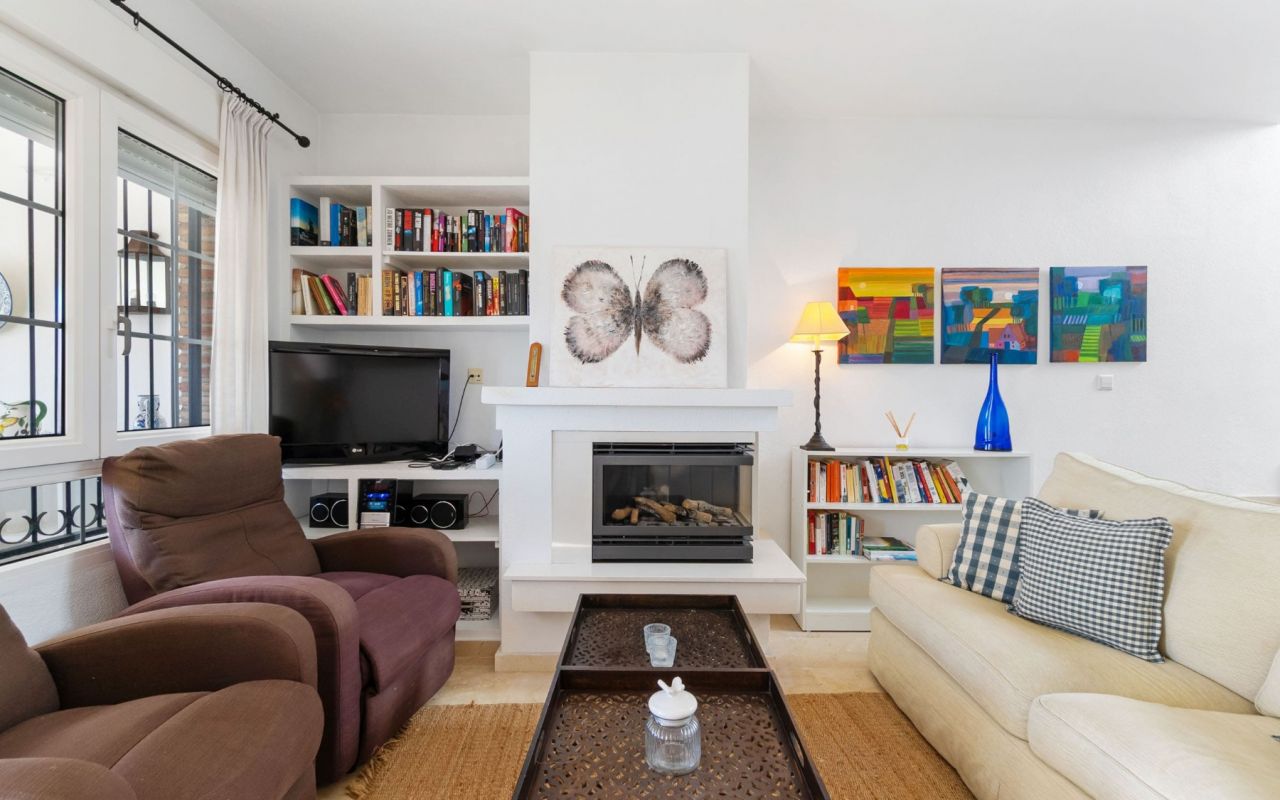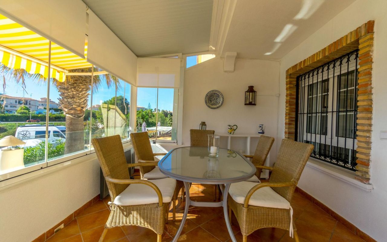 Ved inngangen finner du en solrik flislagt hage, perfekt for avslapning utendørs og for å nyte det fantastiske klimaet hele året. En innglasset terrasse med fri utsikt fører deg inn i en lys og romslig stue/spisestue med peis. Den amerikanske kjøkkenlñsningen er fullt utstyrt og åpent mot stuen.