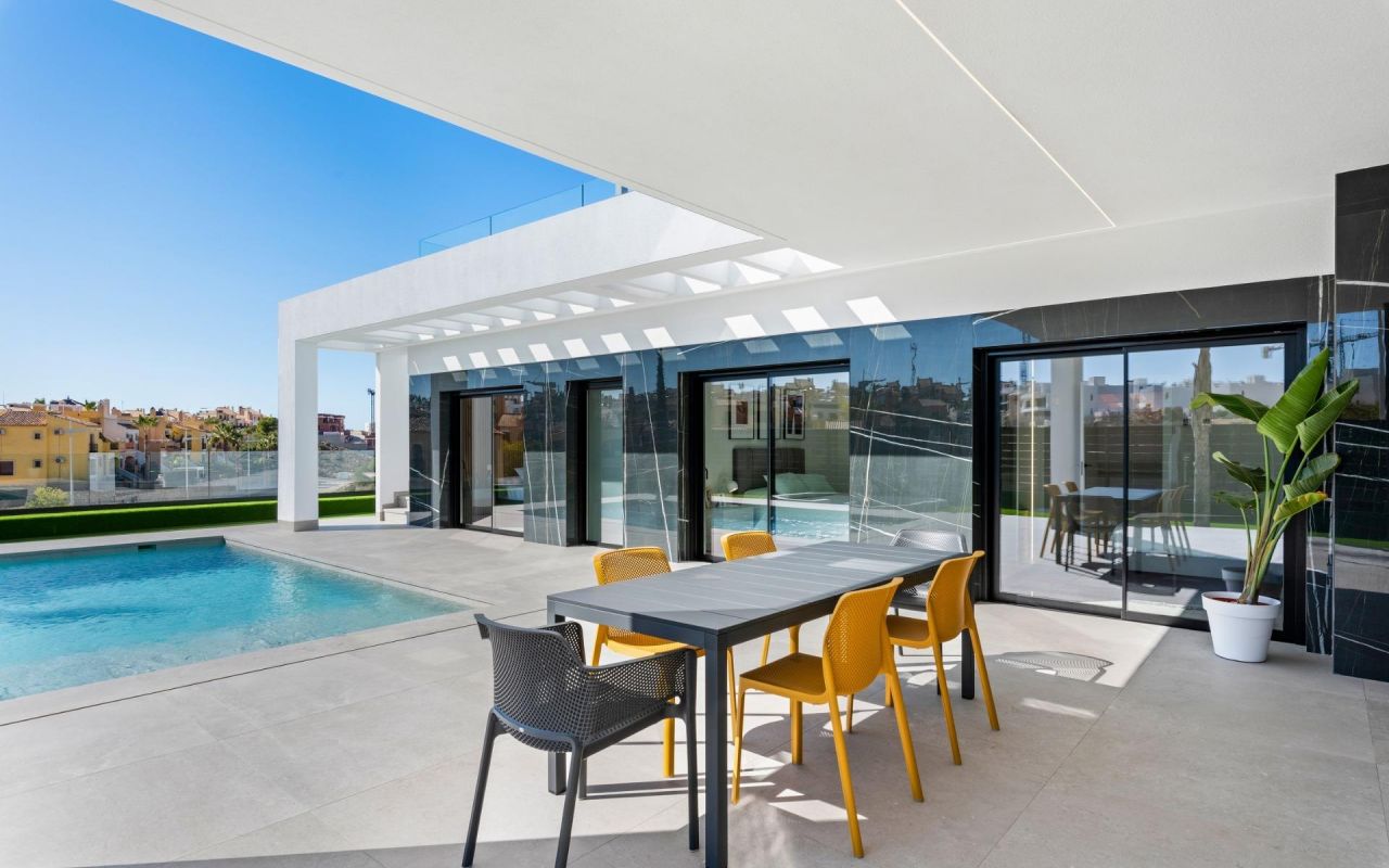 Disse villaene er bygget med førsteklasses materialer og overflater for å sikre komfort, effektivitet og moderne stil. Funksjonene inkluderer en forsterket sikkerhetsdør, motoriserte persienner, fullt utstyrte kjøkken med hvitevarer og bad med møbler, speil og dusjvegger. Solariet på taket leveres med et sommerkjøkken og pergola, som skaper den perfekte rammen for utendørs servering og avslapning. Et LED-belysningspakke for interiør og eksteriør er også inkludert, noe som forbedrer både design og atmosfære.