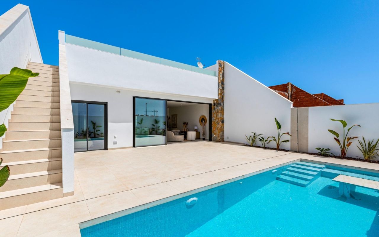 Nybyggede villaer nær Serena Golf i Los Alcazares Moderne villaer i en førsteklasses beliggenhet ved kysten og golfbanen Dette eksklusive nybyggprosjektet tilbyr moderne villaer i Los Alcazares, like ved den prestisjetunge Serena Golf og bare 1,2 km fra sandstrendene ved Mar Menor. Disse boligene ligger i et av de mest attraktive områdene i Murcia-regionen og kombinerer moderne design, komfort og en utmerket beliggenhet nær sjøen, golfbanen og alle daglige tjenester. Los Alcazares er en veletablert kystby kjent for sin avslappede livsstil, lange promenade, vannsport og milde klima gjennom hele året. Enetasjes design med private uteområder Utbyggingen består av stilige villaer med 3 soverom og 2 bad, tilgjengelig i to forskjellige størrelser på henholdsvis ca. 106 kvm og 130 kvm. Den største modellen har også et ekstra gjestetoalett. Alle villaene er designet i én etasje, noe som gir praktisk og komfortabel boform. Det åpne kjøkkenet, spisestuen og stuen har direkte tilgang til en terrasse og privat hage med svømmebasseng, noe som skaper et ideelt rom for innendørs og utendørs opphold. Hver eiendom har også et privat solarium og parkering på tomten. Høy kvalitet og moderne utstyr Disse villaene er bygget med materialer av høy kvalitet og utstyrt med moderne funksjoner. De fullt utstyrte kjøkkenene er tilgjengelige i hvit høyglans eller trefinish og inkluderer benkeplater i kvarts, vask i rustfritt stål, induksjonstopp med integrert avtrekk, stekeovn, mikrobølgeovn, vaskemaskin, integrert kjøleskap og oppvaskmaskin. Badene er utstyrt med møbler, speil, belysning og elektriske håndklestørkere. Ytterligere funksjoner inkluderer elektriske persienner i soverommene, LED-belysning i hele eiendommen og et komplett kanalisert klimaanlegg fra Fujitsu. Privat basseng og energieffektiv komfort Hver villa har et privat svømmebasseng med blå keramiske fliser, integrerte trappetrinn og hvit LED-belysning. Bassenget er forberedt for installasjon av varmepumpe. Kombinasjonen av effektiv klimakontroll, moderne konstruksjon og gjennomtenkt design sikrer komfort hele året. Utmerket tilknytning og viktige avstander Villaene ligger i gangavstand fra sentrum av Los Alcazares og svært nær Serena Golf. Stranden ligger omtrent 1,2 km unna. Byen Cartagena ligger rundt 20 km unna og tilbyr et rikt kulturelt og gastronomisk miljø. Murcia Corvera internasjonale lufthavn ligger omtrent 22 km unna, og Alicante lufthavn ligger omtrent 90 km unna. Flere golfbaner og marinaer ligger også i nærheten, noe som gjør dette stedet ideelt både for permanent opphold og ferier. Ditt ideelle hjem ved sjøen og golfbanen Hvis du er på utkikk etter en moderne nybygget villa nær stranden og golfbanen i Los Alcazares, kan du kontakte oss i dag for mer informasjon eller for å avtale en privat visning.