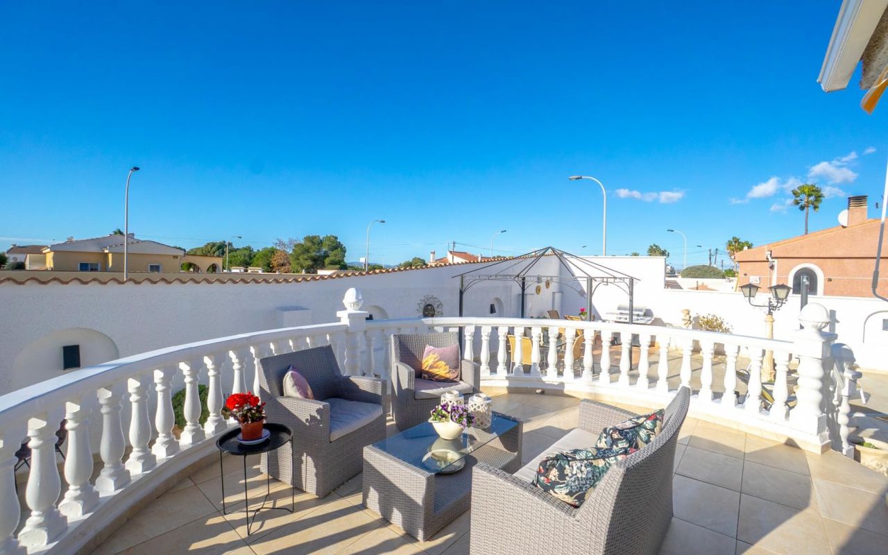 Boligen ligger på en 400 m² stor tomt med velholdte hageområder, privat svømmebasseng, utekjøkken, utendørs spiseplass med grill samt lukket garasje – perfekt for å nyte middelhavsklimaet året rundt.