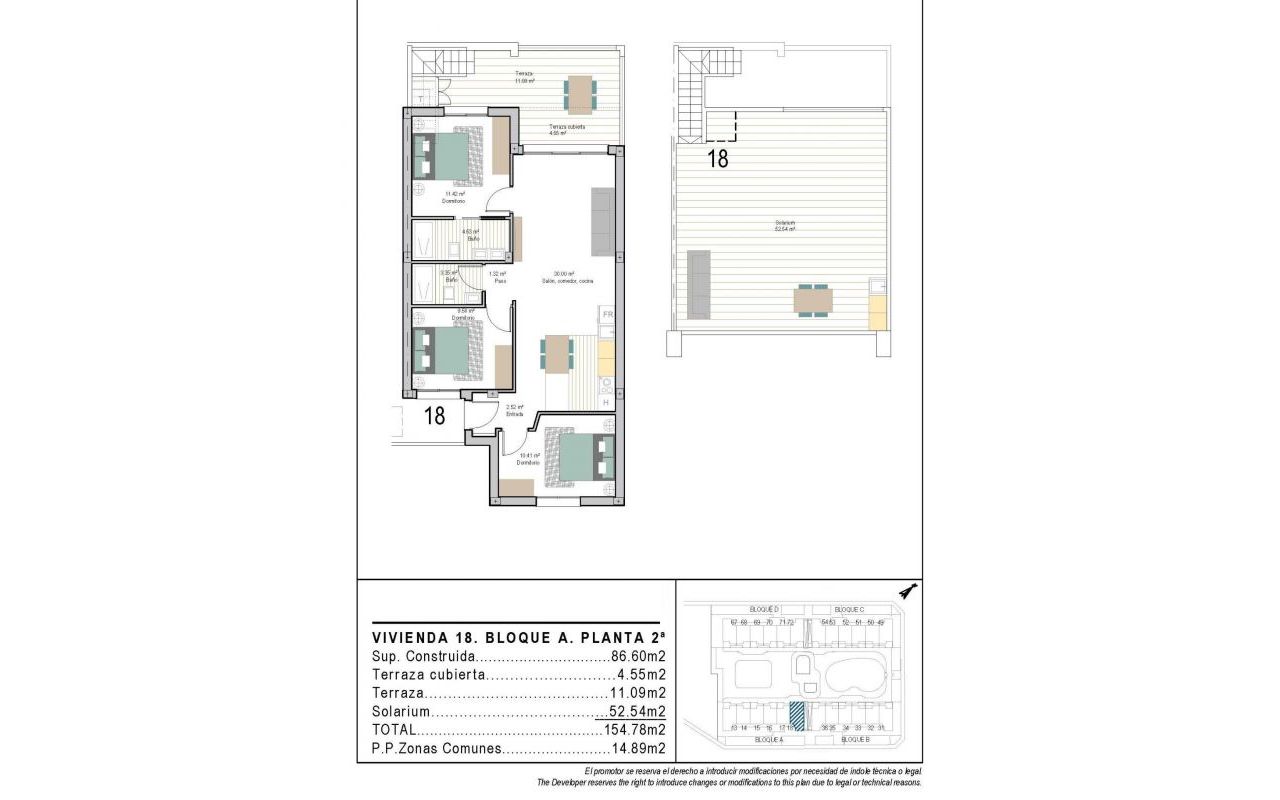 Moderne nybyggede leiligheter i San Cayetano, Torrepacheco, Murcia Moderne livsstil i fredelige middelhavsomgivelser Dette eksklusive nye boligkomplekset ligger i San Cayetano, Murcia, en del av kommunen Torre Pacheco, bare 9 km fra sjøen og omgitt av flere kjente golfbaner. Prosjektet kombinerer ro, komfort og moderne design, og tilbyr et ideelt miljø for permanent opphold, ferie eller investering på Costa Calida. Utbyggingen består av 72 leiligheter med 2 og 3 soverom og 2 bad, hvorav ett er eget bad, fordelt på fire moderne bygninger. En andre fase med bungalower og villaer er også planlagt, noe som vil øke verdien og attraktiviteten til området ytterligere. Designede fellesarealer for avslapning og velvære Beboerne vil kunne nyte nøye anlagte fellesarealer som inkluderer to svømmebassenger, vakre hager og et fullt utstyrt treningsstudio. Disse områdene skaper et hyggelig og sosialt miljø hvor naboene kan slappe av, trene og nyte den middelhavske livsstilen. Boligkomplekset har også 40 kW solcellepaneler som bidrar til å dekke strømkostnadene i fellesskapet, og dermed til et mer bærekraftig og energieffektivt bomiljø. Leiligheter med private uteområder og solarium Hver leilighet er designet for å få mest mulig ut av livet utendørs. Leilighetene i første etasje har private hager, leilighetene i andre etasje har romslige terrasser, og leilighetene i øverste etasje har både terrasse og privat solarium på taket. Alle leilighetene har sommerkjøkken på terrassen eller solariet, perfekt for å nyte solen hele året. Alle boliger har en utendørs parkeringsplass og et privat bod i kjelleren, noe som gir ekstra bekvemmelighet og praktiskhet. Kvalitetsfunksjoner og energieffektive installasjoner Disse nybygde leilighetene leveres med kvalitetsfinish og moderne installasjoner for å sikre komfort og funksjonalitet, inkludert: Fullt utstyrt kjøkken med hvitevarer Fullt utstyrte bad med møbler, speil, belysning og dusjvegger Forhåndsinstallasjon for kanalisert klimaanlegg Aerotermisk system for varmt vann Kombinasjonen av moderne materialer og energieffektive systemer gjør disse boligene ideelle for bruk hele året. Utmerket beliggenhet nær golf, strender og tjenester San Cayetano er en rolig og godt tilknyttet landsby med lokale fasiliteter, butikker og tjenester. Den strategiske beliggenheten gir enkel tilgang til strender, golfbaner og viktige transportforbindelser. Viktige avstander til interessante steder inkluderer: Mar Menor-strendene 9 km Roda Golf 6 km La Serena Golf 14 km Los Alcazares 10 km Cartagena 30 km Murcia Corvera flyplass 25 km Alicante flyplass 90 km Sikre deg din eiendom i San Cayetano i dag Dette moderne boligkomplekset tilbyr en utmerket mulighet til å nyte middelhavslivet i et fredelig, men likevel godt tilknyttet område. Kontakt oss i dag for mer informasjon og reserver din nye leilighet i San Cayetano.