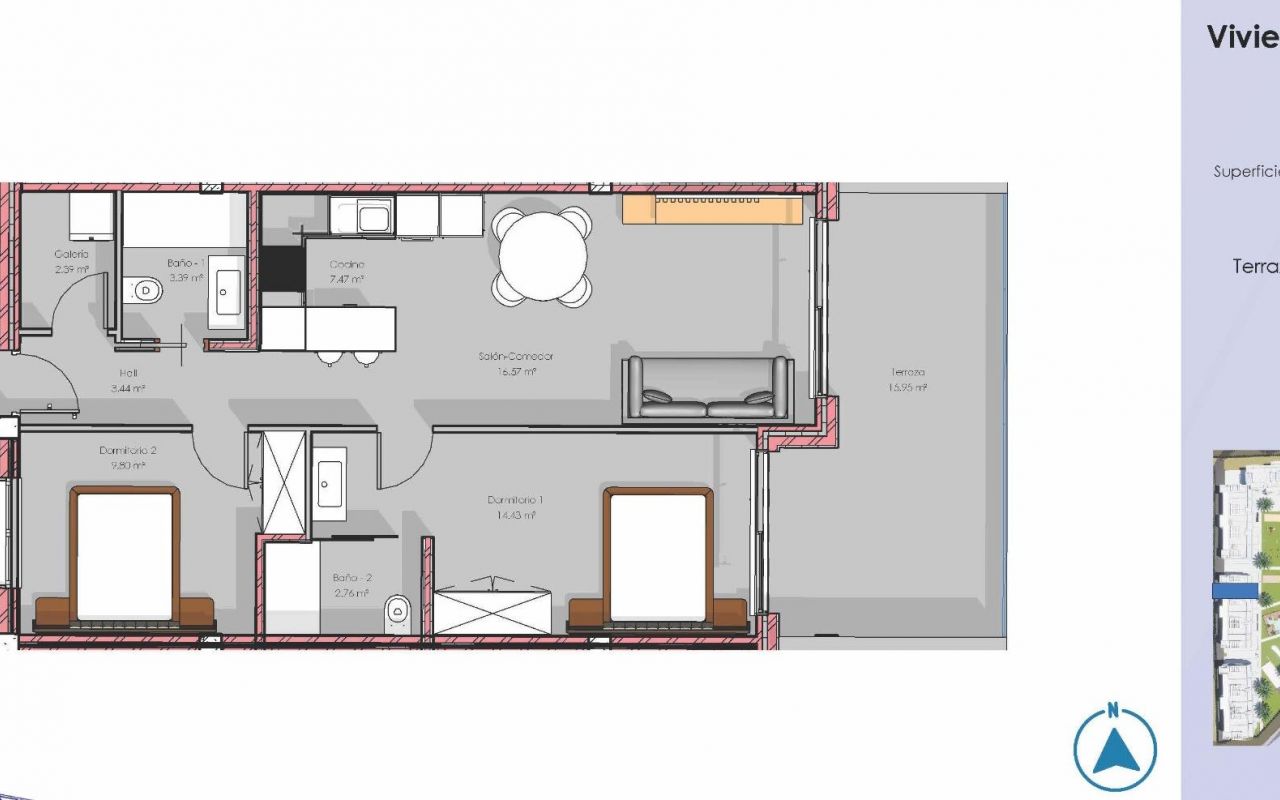 Moderne møblerte leiligheter i El Raso-Guardamar – moderne livsstil nær stranden og golfbanen Eksklusivt boligprosjekt i Guardamar del Segura Oppdag dette eksepsjonelle nybyggprosjektet med 120 stilfulle leiligheter i El Raso, et svært ettertraktet område i Guardamar del Segura på Costa Blanca. Omgitt av naturlandskap og nær Middelhavskysten tilbyr dette boligkomplekset en perfekt balanse mellom ro og tilgjengelighet. El Raso er kjent for sitt fredelige miljø, samtidig som det ligger bare noen minutter unna det livlige sentrum, sandstrender og et bredt utvalg av tjenester, inkludert restauranter, butikker og fritidsfasiliteter. Moderne boliger designet for komfort og stil Prosjektet tilbyr leiligheter med 2 og 3 soverom med ulike planløsninger som passer til enhver livsstil. Velg mellom leiligheter i første etasje med private hager, leiligheter i mellometasjer med romslige terrasser eller penthouse-leiligheter med private solterrasser som er ideelle for å nyte middelhavsklimaet hele året. Alle boligene leveres fullt møblerte og innflyttingsklare, inkludert fullt utstyrte kjøkken med hvitevarer og komplette baderomsinnredninger med møbler, speil og dusjvegger. Hver bolig inkluderer også underjordisk parkering og et bod, noe som sikrer bekvemmelighet og praktisk bruk fra første dag. Høykvalitetsfunksjoner og energieffektivt boende Disse moderne boligene er bygget med sans for detaljer og designet for maksimal komfort. Funksjonene inkluderer sentral klimaanlegg, elektriske persienner og et komplett belysningspakke. Kombinasjonen av kvalitetsmaterialer og smart design skaper lyse og funksjonelle oppholdsrom som forbedrer hverdagen samtidig som de sikrer energieffektivitet. Enestående fellesarealer og livsstilsfasiliteter Boligkomplekset tilbyr et bredt utvalg av førsteklasses fellesfasiliteter designet for avslapning og velvære. Beboerne kan nyte et stort svømmebasseng omgitt av anlagte hager, et fullt utstyrt treningsstudio, innendørs spa, petanque-område og lekeplass for barn. Hver detalj er nøye gjennomtenkt for å skape et fellesskap der komfort, fritid og sosialt samvær smelter sammen. Førsteklasses beliggenhet med utmerket tilknytning El Raso har en strategisk beliggenhet nær viktige severdigheter: Guardamar sentrum 4 km Moncayo-stranden 5 km Ciudad Quesada 5 km Torrevieja og Habaneras kjøpesenter 8 km La Marquesa Golf 6 km La Finca Golf 12 km Vistabella Golf 18 km Alicante lufthavn 30 km Murcia Corvera lufthavn 75 km Ditt ideelle hjem eller investering på Costa Blanca Enten du er på jakt etter en fast bolig, et feriehus eller en smart investeringsmulighet, tilbyr disse fullt møblerte leilighetene i Guardamar del Segura eksepsjonell verdi i en førsteklasses beliggenhet ved kysten. Kontakt oss i dag for å få mer informasjon eller for å avtale en visning og sikre deg ditt nye hjem på Costa Blanca.