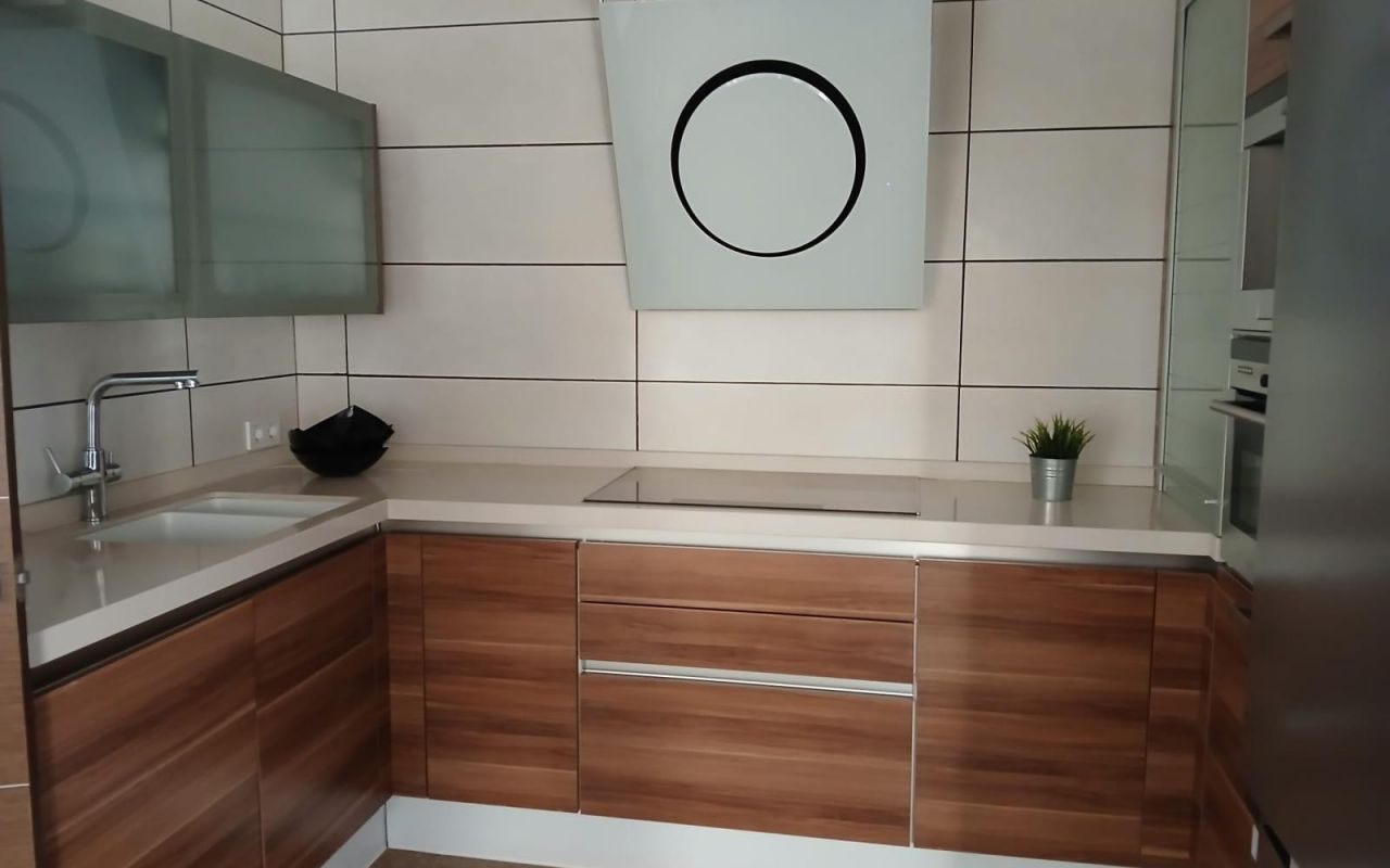 Upon entering through a spacious, practical hallway, you are greeted by an expansive living room adorned with a gas fireplace and solid panoramic windows facing west, perfect for enjoying sunsets. It is an ideal gathering place year-round. The exquisite Schmidt kitchen is both stylish and fully equipped with high-quality appliances, a dining table with chairs, and direct access to the terrace, creating a seamless and bright space. Fully fitted with superb appliances, this kitchen is every amateur and professional chef's dream.