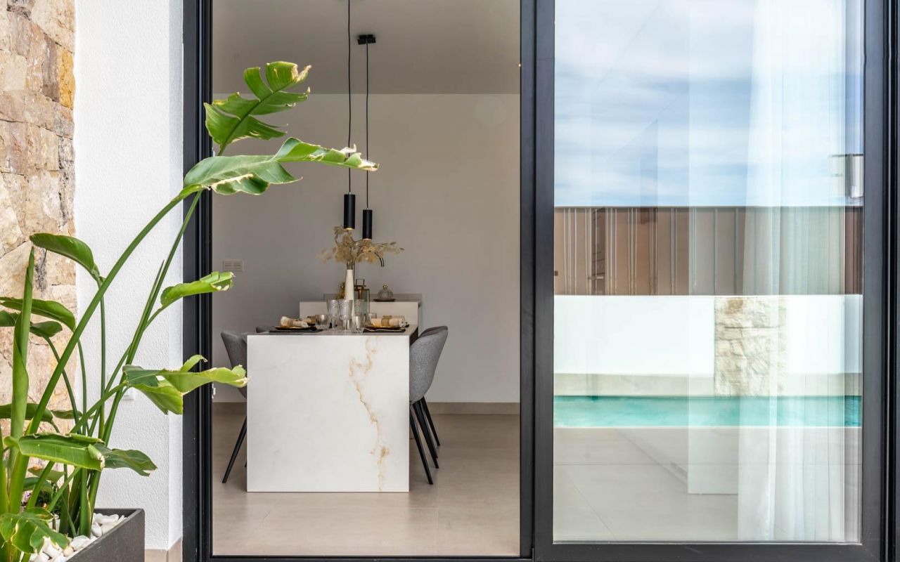 New Build Independent Villas with Private Pool and Solarium in Roldán, Torre-Pacheco Modern Single-Level Villas with Exclusive Design These brand-new 3-bedroom, 2-bathroom villas in Roldán, Torre-Pacheco, offer a contemporary and eco-friendly design with comfort and lifestyle in mind. Built on a single level, each home features a spacious open-plan living and dining area with a fully equipped modern kitchen, seamlessly connected to large terraces and a rooftop solarium. The villas are thoughtfully designed to blend functionality and aesthetics, with angled stone-clad facades, sleek finishes, and plenty of outdoor space to enjoy the Mediterranean sun all year round. Private Outdoor Space and Premium Features Every villa comes complete with: Private swimming pool and outdoor shower Roof-top solarium with ample space for sunbathing or creating a chill-out zone Terrace and garden areas on the ground level Private driveway for off-road parking LED lighting package for both interior and exterior Pre-installed air conditioning system The master bedroom includes an en-suite bathroom, while two additional bedrooms share a family bathroom, all designed with a contemporary touch and high-quality finishes. Ideal Location Close to Beaches and Golf Roldán is a charming Spanish town in the municipality of Torre-Pacheco, known for its traditional ambiance and complete range of daily services, including supermarkets, restaurants, healthcare facilities, and schools. The location offers proximity to several key attractions: Corvera Airport (RMU) – 15 km Beaches of the Mar Menor and Mediterranean Sea – 20 km Golf courses (La Torre Golf and Las Terrazas de La Torre) – within 4 km Cartagena city centre – 32 km Zenia Boulevard Shopping Centre – 35 km Marina of Los Alcázares – 22 km Whether you're seeking a holiday home, permanent residence, or a strong rental investment, this location offers easy access to coastal attractions, sports facilities, and urban convenience. Your New Life in the Sun Awaits Don’t miss the opportunity to own one of these stylish new villas in Roldán. Contact us today for more details, to arrange a visit, or to secure your new home on the Costa Cálida before they're all reserved.
