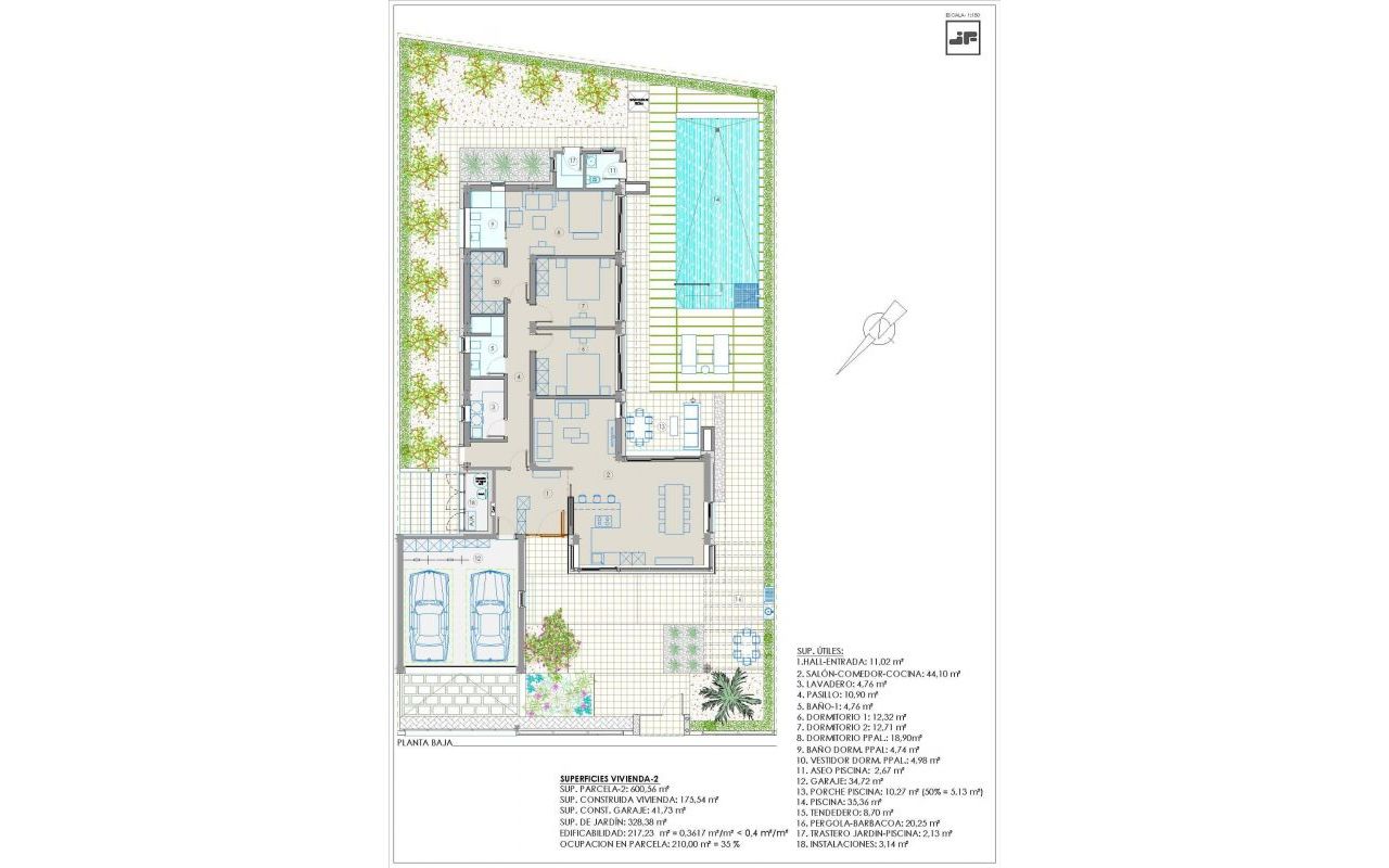 NEW BUILT VILLA ON A FLOOR Three exclusive villas in a residential area in San Javier with 600 m2 of plot and 217 m2 of built area on one floor, private pool and large garden areas. Residential with an architectural design based on clear, cubic and functional lines in an exclusive residential enclave in San Javier (Murcia). Automated garden and garage access doors with infrared remote control. Large covered garage for two vehicles with separate entrance. Gardens with a water drainage system on the floor, completely finished and customizable including vegetation, irrigation and lighting.