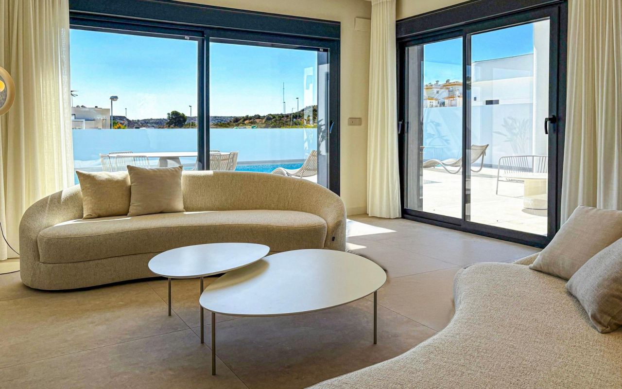 Elegant modern 245 m² corner villa with 4 beds, 3 baths and 1 guest toilet across 3 levels. Bright living and dining areas open to sunny terraces and a large 4x10m private pool. 3 Bedrooms and a cozy second lounge (which can be converted in a 5th bedroom) sit in the underbuild, together with a garage and a laundry room. The master suite enjoys its own floor at first level with a private open terrace and panoramic views. High-End Finishes and Sustainable Features Every detail of this villa has been carefully designed for comfort and efficiency. It includes: Fully furnished kitchen with integrated appliances Bathrooms with furniture, shower screens, and electric towel heaters Air conditioning by ducts (fully installed) Photovoltaic solar panels for energy savings Electric shutters in living room and bedrooms Armoured entrance door for maximum security Prime Location in Ciudad Quesada Nestled in an exclusive and quiet area, this villa enjoys an unbeatable location close to everything. La Marquesa Golf Course is just 1 km away, offering a haven for golf lovers. The Blue Flag beaches of Guardamar del Segura are only 6 km away, while Torrevieja and Orihuela Costa can be reached in under 15 minutes. Alicante International Airport is approximately 40 km (35 minutes), ensuring excellent connectivity. Experience the Mediterranean Lifestyle Surrounded by orange groves, sports clubs, restaurants, and all essential services, Ciudad Quesada offers a vibrant yet peaceful environment. It’s the ideal setting for those seeking a luxury home in the sun; perfect as a permanent residence, vacation retreat, or investment property. Contact us today to schedule a visit and experience the best of Mediterranean living in your new home in Ciudad Quesada.