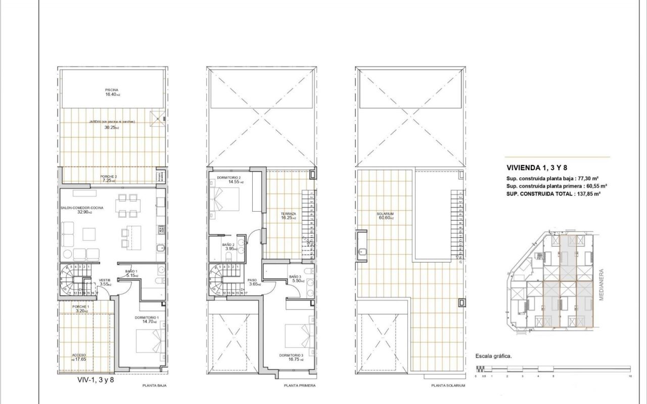 Newly Built Townhouses in San Javier - Modern Design and Privileged Location Contemporary Design Townhouses with Private Swimming Pool Discover this exclusive complex of 9 brand new townhouses in San Javier, Murcia, designed to offer maximum comfort and a modern lifestyle. Each property has a private swimming pool, terrace, solarium and parking space, providing an ideal space for relaxation and enjoyment all year round. The homes have been built with high quality materials and an open-plan design that makes the most of natural light. They are perfect for both a permanent residence and a holiday home on the Costa Cálida. High Quality Distribution and Equipment Each townhouse has: 3 spacious bedrooms with fitted wardrobes and chest of drawers. 3 fully fitted bathrooms with furniture, mirrors and screens. Open concept kitchen, fully fitted and with white goods included. Spacious living-dining room, with large windows that connect to the terrace. Private swimming pool with shower and garden with artificial grass. Solarium with summer kitchen, perfect to enjoy the Mediterranean climate. Pre-installation of ducted air conditioning on each floor. PVC exterior carpentry with double glazing, guaranteeing thermal and acoustic insulation. Security entrance door, for greater peace of mind and protection. Strategic location in San Javier San Javier is a coastal town with a wide range of services, sports facilities and leisure areas. The location of this residential allows quick access to: Beaches of the Mar Menor - Only 5 minutes by car. Beaches of the Mediterranean Sea - 10 minutes away. Golf Courses - Various options in the area, ideal for golf lovers. Shopping centres and services - Everything you need just a few minutes away. Murcia-Corvera Airport - 30 minutes away. Alicante Airport - 45 minutes away. Enjoy the Best Climate and Quality of Life in San Javier San Javier is an excellent option for those looking for a property close to the sea, with a privileged climate and access to all kinds of outdoor activities. Don't miss the opportunity to purchase one of these exclusive homes. Contact us today for more information or to schedule a visit.