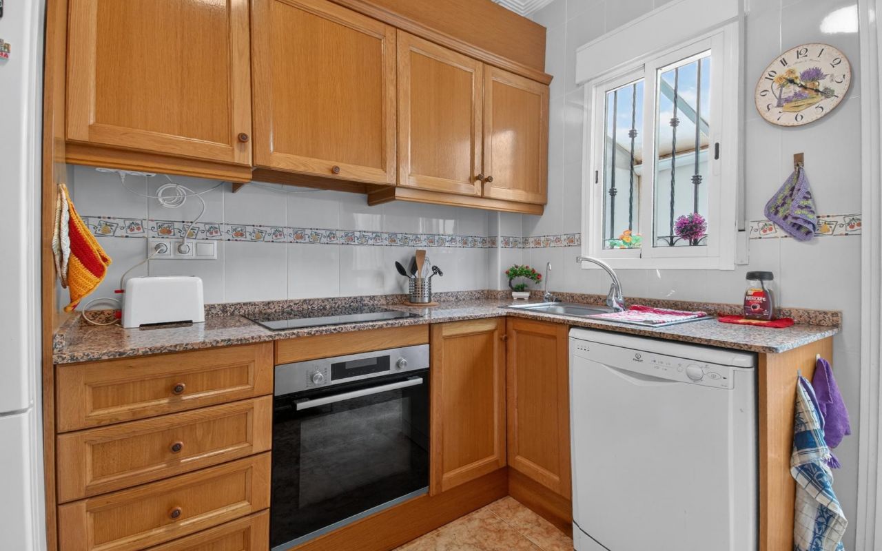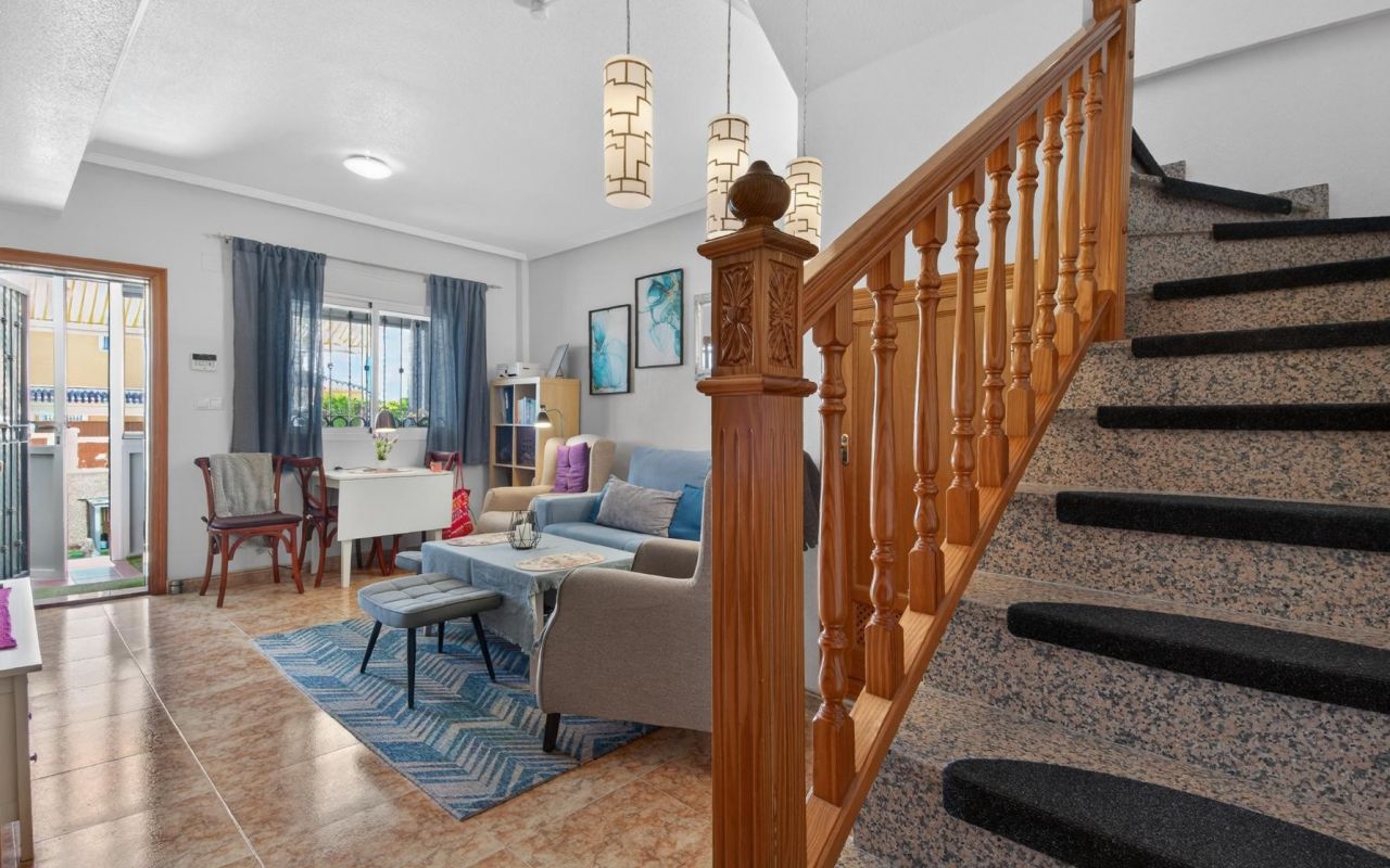 Townhouse in La Ciñuelica 15, Orihuela Costa, distributed over 2 floors plus a rooftop solarium. At the entrance, there is a spacious south-facing tiled terrace, ensuring plenty of natural light throughout the day.