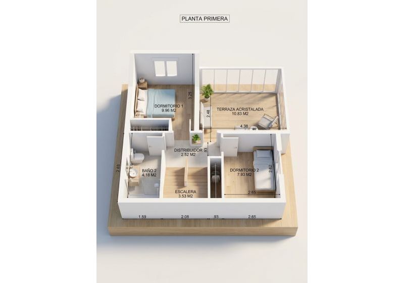 On the first floor, there are two bedrooms, a second full bathroom, and a glazed terrace with versatile use, ideal as a relaxation area, office, or even an additional bedroom if required.