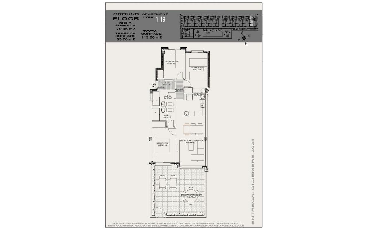Nueva Promoción en Torrevieja, a 1 km del Mar Apartamentos modernos de 2 y 3 dormitorios Situado en la vibrante zona de Altos del Sol de Torrevieja, este nuevo complejo residencial ofrece una variedad de opciones de apartamentos con 2 y 3 dormitorios. Los apartamentos de la planta baja disponen de jardín privado, mientras que los de la planta superior cuentan con solárium privado para relajarse al aire libre. Además, el complejo incluye una casa adosada para quienes buscan más espacio y privacidad. Cada unidad incluye una plaza de aparcamiento subterráneo, y hay trasteros disponibles como opción. Amplias zonas comunes y servicios para toda la familia El complejo residencial está cuidadosamente diseñado con amplios espacios comunes, con jardines que crean un ambiente tranquilo. Las familias pueden disfrutar de una gran piscina comunitaria con zona infantil, perfecta para relajarse y socializar bajo el cálido sol mediterráneo. La urbanización se encuentra a 1 km de la Playa de Los Locos, por lo que los residentes podrán acceder cómodamente a la playa. Acabados de alta calidad y eficiencia energética Estas viviendas destacan por sus acabados de alta calidad y su atención al detalle. Cada unidad está equipada con un sistema de paneles solares fotovoltaicos de 600W, proporcionando una solución energética ecológica. Otras características de primera calidad son las barbacoas integradas en los solariums, las puertas de entrada blindadas, los armarios empotrados con accesorios interiores, los muebles de baño con mamparas de ducha y la calefacción por suelo radiante en los baños, que garantizan el confort y el estilo en cada rincón. Ubicación ideal cerca de servicios y atracciones Esta urbanización está situada cerca de todos los servicios esenciales, por lo que es una ubicación conveniente tanto para los residentes permanentes como para los que buscan una casa de vacaciones. Altos del Sol es conocida por su zona bien comunicada, con tiendas locales, opciones gastronómicas y lugares de ocio a poca distancia. El aeropuerto de Alicante-Elche se encuentra a 45 minutos en coche (43 km), mientras que el centro comercial Habaneras está a sólo 3 km de distancia, proporcionando una amplia experiencia de compras. Experimente el estilo de vida mediterráneo de Torrevieja Torrevieja, situada en el sur de Alicante, ofrece una experiencia mediterránea por excelencia. Con más de 300 días de sol al año y una temperatura media anual de 20ºC, los residentes pueden disfrutar de un tiempo maravilloso durante todo el año. La ciudad es famosa por su rica gastronomía, con ingredientes frescos del mar y de las granjas locales. Además, Torrevieja cuenta con pintorescas playas, paseos marítimos, museos y numerosas actividades adecuadas para familias con niños, lo que garantiza un estilo de vida lleno de ocio y relajación. Venga a explorar Torrevieja Tanto si busca una vibrante comunidad costera como un tranquilo retiro, esta promoción le ofrece una oportunidad única para disfrutar de lo mejor del encanto costero de Torrevieja. Experimente todo lo que esta hermosa ciudad tiene que ofrecer, desde su cálido clima hasta su rico patrimonio cultural y culinario.
