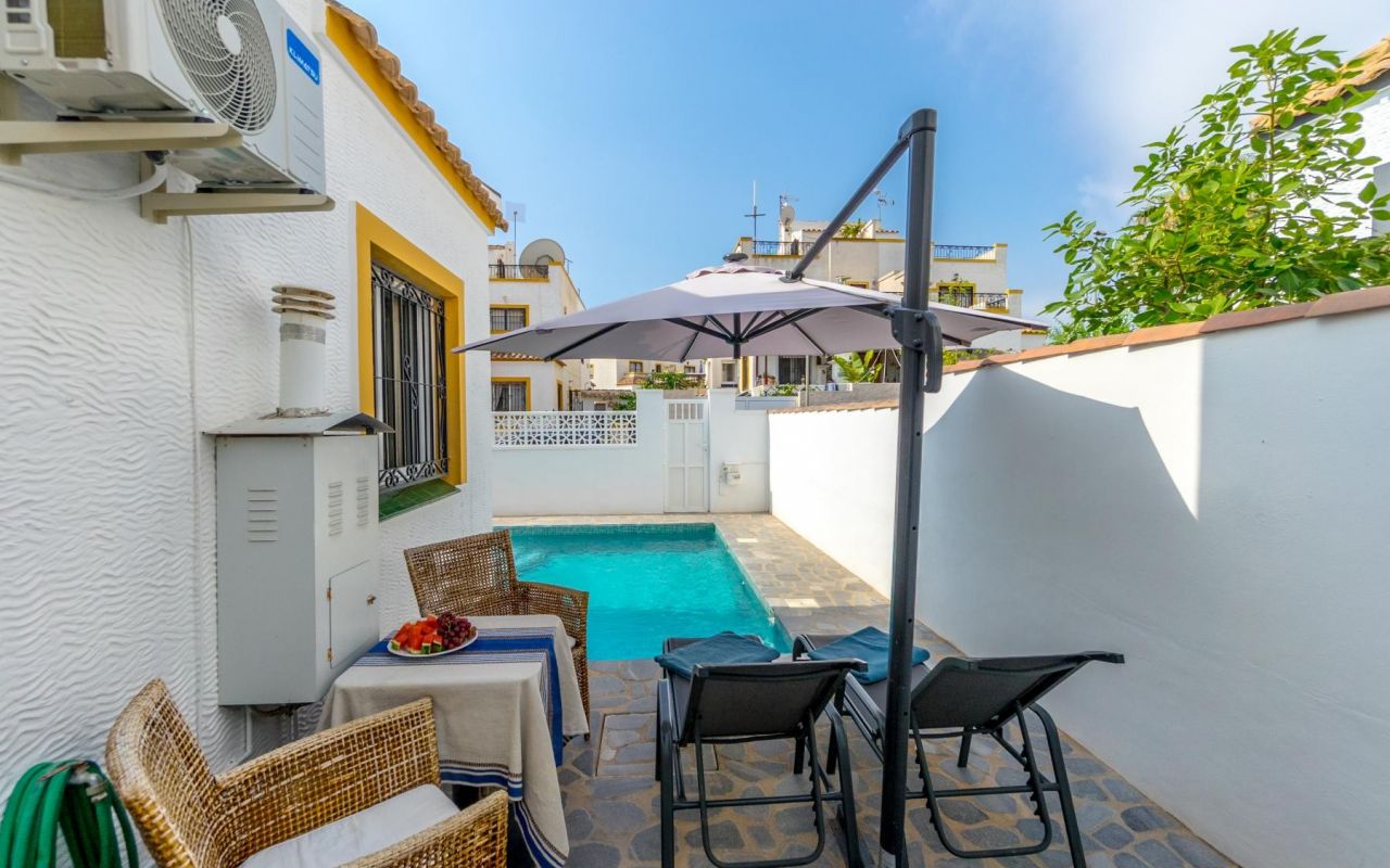 La casa está en excelente estado, con mejoras como el suelo del jardín, su piscina privada, y pintura reciente tanto en el interior como en el exterior. Además, su orientación suroeste garantiza sol y luz natural durante todo el día.
