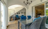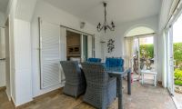 Desde el salón se accede a una amplia terraza, parcialmente acristalada, ideal como espacio adicional durante todo el año. Hay espacio de sobra para un rincón de lectura o un comedor. Además, dispone de un jardín soleado con suelos renovados y una sensación de total privacidad, sin vistas directas desde vecinos, perfecto para disfrutar del sol o pasar el tiempo con familiares y amigos.