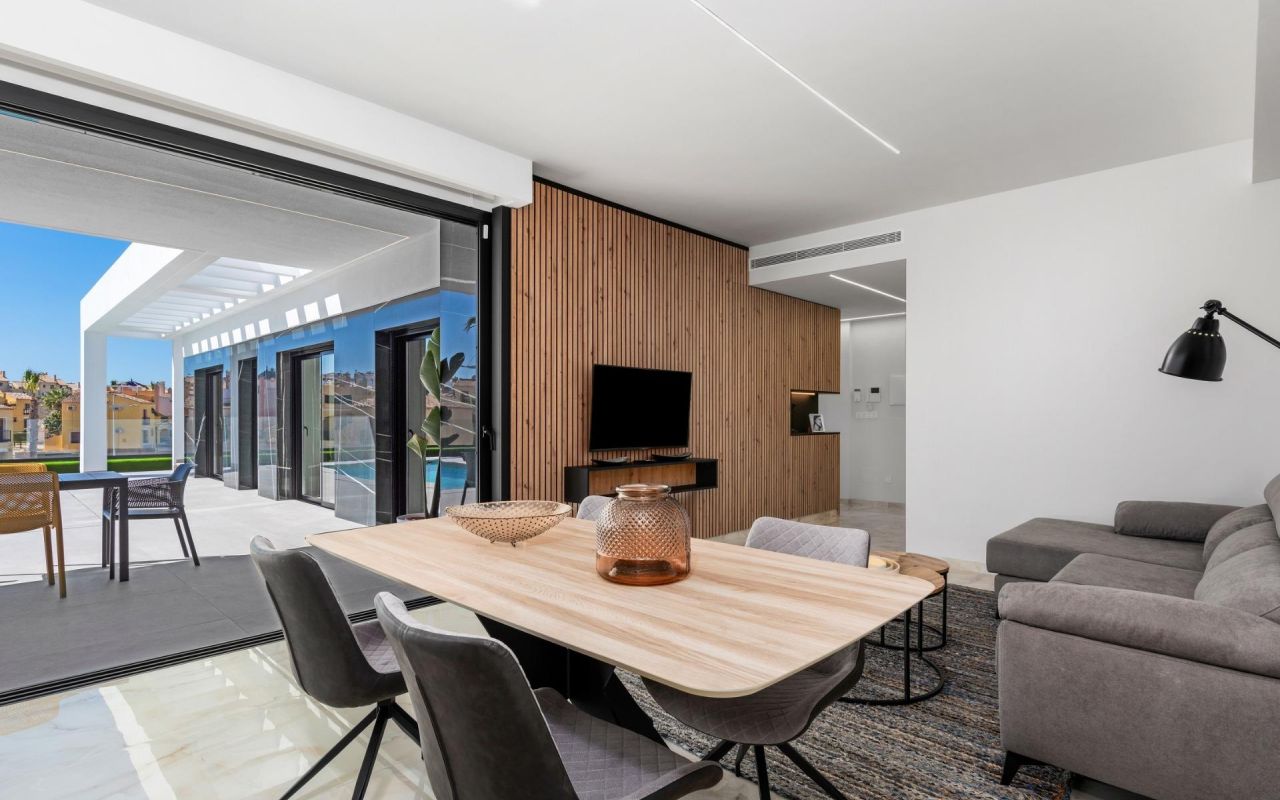 Estas villas están construidas con materiales y acabados de primera calidad para garantizar el confort, la eficiencia y el estilo moderno. Entre sus características se incluyen una puerta de entrada de seguridad reforzada, persianas motorizadas, cocinas totalmente amuebladas y equipadas con electrodomésticos, y baños completos con muebles, espejos y mamparas de ducha. El solárium de la azotea cuenta con una cocina de verano y una pérgola, lo que crea el escenario perfecto para cenar al aire libre y relajarse. También se incluye un paquete de iluminación LED interior y exterior, que realza tanto el diseño como el ambiente.