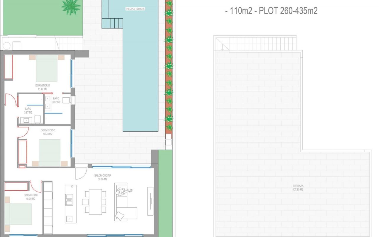 Villas construidas en 1 planta y consta de 3 dormitorios, 2 baños, cocina americana, el salón con vistas abiertas a la terraza, solarium, jardín privado con la piscina.