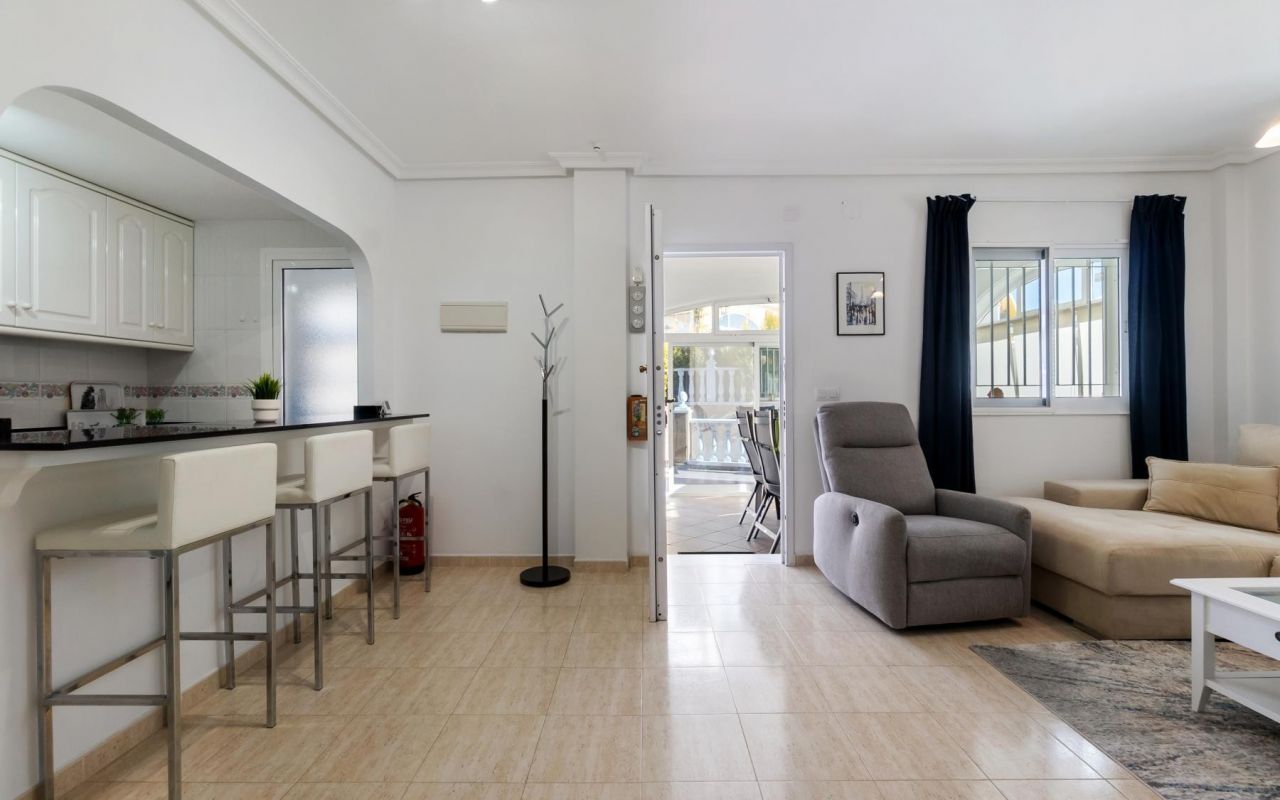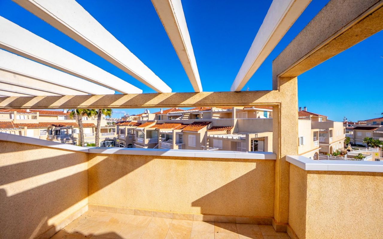 Adosado tipo Quad en esquina, de dos plantas más solárium, con escalera interior y ubicado a pocos pasos de la piscina comunitaria, en la consolidada y demandada urbanización Zeniamar V, Orihuela Costa. Una propiedad que destaca por su luminosidad, comodidad y entorno tranquilo, ideal tanto como residencia habitual como vivienda vacacional.