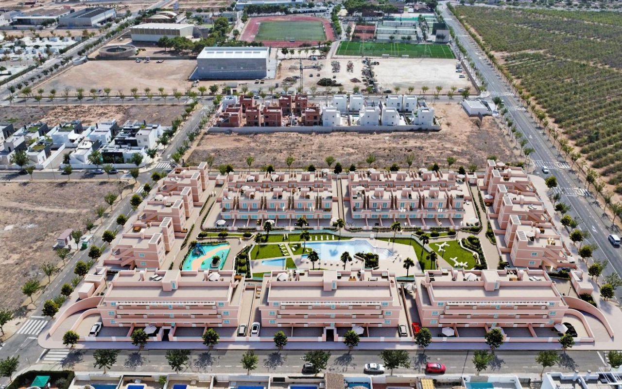 Exclusivo Residencial de Obra Nueva en Pilar de la Horadada, Costa Blanca Viviendas Modernas Cerca del Mar Descubra este nuevo complejo residencial en Pilar de la Horadada, una ubicación privilegiada en la Costa Blanca. A solo 2 km de la playa, este proyecto ofrece una amplia variedad de viviendas de 3 dormitorios y 2 baños, con aparcamiento privado incluido en el precio. El residencial cuenta con amplias zonas comunes, incluyendo una piscina comunitaria, jardines paisajísticos y una zona de juegos infantiles, ideales para el disfrute de toda la familia. Diferentes Tipologías para Adaptarse a su Estilo de Vida Esta promoción ofrece diversas opciones de vivienda: Plantas bajas con jardín privado. Apartamentos en planta intermedia con amplias terrazas. Áticos con solárium privado. Bungalows en planta baja con jardín privado. Bungalows en planta alta con jardín y solárium privado. Adosados y pareados con jardín y solárium. Todas las viviendas han sido diseñadas con un estilo moderno y funcional, utilizando materiales de alta calidad y acabados contemporáneos. Equipamiento y Calidades Las viviendas cuentan con: Preinstalación de aire acondicionado por conductos. Carpintería exterior de aluminio con rotura de puente térmico y doble acristalamiento. Puerta de acceso acorazada para mayor seguridad. Sistema de aerotermia para producción eficiente de agua caliente. Armarios empotrados con iluminación LED. Muebles de baño y mamparas incluidos. Pilar de la Horadada: Un Lugar Privilegiado para Vivir Pilar de la Horadada es un municipio costero en el extremo sur de la Costa Blanca, con un clima excepcional y una excelente calidad de vida. Su animada calle principal ofrece una amplia variedad de tiendas, supermercados, restaurantes y servicios esenciales. A solo 5 minutos en coche, encontrará las impresionantes playas de Torre de la Horadada y Mil Palmeras, con arena dorada y un encantador paseo marítimo. Además, la zona cuenta con carriles bici, rutas de senderismo y múltiples actividades deportivas. Distancias a Puntos Clave Campo de golf Lo Romero – 5 km (10 minutos en coche). Aeropuerto de Corvera (Murcia) – 40 km (40 minutos en coche). Aeropuerto de Alicante – 55 km (55 minutos en coche). Centro Comercial Zenia Boulevard – 15 km (15 minutos en coche). Puerto Deportivo Torre de la Horadada – 3 km (5 minutos en coche). Solicite Más Información Hoy Mismo No deje pasar esta oportunidad de adquirir una vivienda de obra nueva en una de las mejores zonas de la Costa Blanca. Contáctenos ahora para recibir más detalles y concertar una visita.