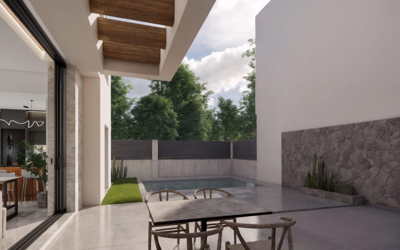Modernas villas de nueva construcción en La Herrada Los Montesinos con piscina privada Exclusivo proyecto residencial en un entorno tranquilo Situada en la prestigiosa urbanización La Herrada, en Los Montesinos, esta exclusiva promoción de 16 modernas villas ofrece privacidad, comodidad y una excelente calidad de vida. La Herrada es conocida por su tranquilo ambiente residencial, su proximidad a los servicios cotidianos y su privilegiada ubicación entre las famosas salinas de Torrevieja y La Mata. Es un lugar ideal para aquellos que buscan un estilo de vida mediterráneo relajado y saludable en el sur de la Costa Blanca. Diseño contemporáneo con espacios interiores optimizados Cada villa tiene 130 m² de superficie habitable bien distribuida en dos plantas, diseñadas para maximizar la luz natural y la funcionalidad. Construidas en parcelas a partir de 250 m², las propiedades ofrecen amplias zonas exteriores perfectas para tomar el sol, divertirse o relajarse junto a la piscina privada. Cómoda distribución en dos plantas La planta baja cuenta con un salón diáfano con cocina totalmente integrada y acceso directo al jardín y a la zona de la piscina. Esta planta también incluye dos dormitorios, un cuarto de baño completo y un práctico lavadero. En la planta superior hay dos amplios dormitorios, cada uno con su propio cuarto de baño, uno de ellos en suite. Ambos dormitorios tienen acceso a una terraza privada abierta de 28 m². Para aquellos que deseen aún más espacio exterior, hay un solárium opcional en la azotea disponible con un coste adicional. Acabados de alta calidad y características modernas Las villas incluyen acabados de calidad, como muebles de baño, espejos, mamparas de ducha y calefacción por suelo radiante en todos los cuartos de baño. Hay preinstalación para aire acondicionado por conductos, puerta de entrada motorizada para vehículos, aparcamiento privado en la parcela y acceso residencial cerrado a través de una calle interna privada. Ubicación privilegiada cerca de los principales servicios y atracciones Playas de Guardamar y Torrevieja a 9 km La Marquesa Golf, La Finca Golf y Vistabella Golf a menos de 5 km Aeropuerto de Alicante a 29 km Parques naturales, salinas, rutas ciclistas y senderos para hacer senderismo en las inmediaciones Viva cómodamente en el corazón de la Costa Blanca Estas villas de nueva construcción en Los Montesinos ofrecen la combinación perfecta de comodidad moderna, entorno natural y excelente accesibilidad. Tanto si busca una residencia permanente como una casa de vacaciones, esta promoción le ofrece todo lo que necesita para disfrutar de un estilo de vida mediterráneo tranquilo y cómodo. Póngase en contacto con nosotros hoy mismo para concertar una visita y asegurarse su nueva vivienda en La Herrada.
