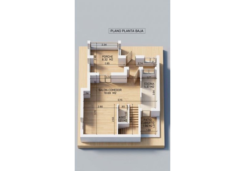 En la planta baja hay una terraza acristalada de invierno que da paso al salón-comedor, con cocina abierta equipada, una galería/lavadero cerrado y un aseo de cortesía. Es una planta pensada para la vida diaria y la conexión con el exterior.