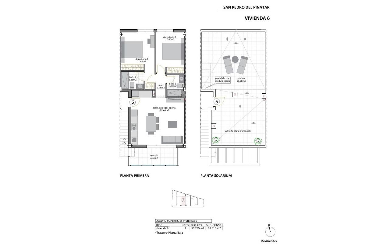 Bungalows nouvellement construits à San Pedro del Pinatar - Situation privilégiée à 500 m de la plage Maisons exclusives de style boutique près de la côte Découvrez ces élégants bungalows neufs au cœur de San Pedro del Pinatar, à seulement 500 mètres des superbes plages de la Mar Menor. Ce lotissement de charme ne comprend que huit maisons caractéristiques, alliant design moderne, confort et mode de vie côtier paisible. Modèles disponibles pour s'adapter à votre style de vie Modèle rez-de-chaussée/jardin : Ce modèle comprend une terrasse à l'avant et un patio spacieux à l'arrière, parfaits pour vivre à l'extérieur. Modèle Penthouse Loft : Comprend un solarium privé sur le toit et une terrasse avant, offrant des vues dégagées et une abondance de lumière. Détails du modèle rez-de-chaussée/jardin Entrez dans un espace de vie lumineux qui se connecte de manière transparente à la salle à manger et à une cuisine entièrement équipée. De grandes portes coulissantes en verre laissent entrer la lumière naturelle, créant une ambiance ouverte et accueillante. L'aménagement comprend deux chambres spacieuses, dont la chambre principale dotée d'une salle de bains attenante, ainsi qu'une salle de bains familiale moderne. Points forts du modèle Penthouse L'accès au penthouse se fait par un escalier privé menant à une grande terrasse. À l'intérieur, un salon et une salle à manger ouverts se mêlent à une cuisine entièrement équipée. Deux chambres à coucher sont incluses, la chambre principale disposant d'une salle de bains attenante. Un solarium privé sur le toit, accessible depuis la cuisine, constitue un endroit idéal pour se détendre ou se divertir. Des rangements supplémentaires au rez-de-chaussée assurent la commodité de l'ensemble. Principales caractéristiques et commodités Éclairage LED intérieur et extérieur. Cuisine entièrement équipée avec plaque de cuisson à induction, four, lave-vaisselle et réfrigérateur/congélateur. Climatisation installée. Place de parking réservée. Jardin commun paysager avec piscine pour les résidents. San Pedro del Pinatar : charme côtier et commodité Situé sur les magnifiques côtes de la Mar Menor et de la Méditerranée, San Pedro del Pinatar est un paradis pour les amateurs de sports nautiques, de voile et de plage. La région voisine de Lo Pagán offre des bains de boue naturels, des eaux calmes et des services tout au long de l'année, notamment des boutiques, des restaurants et des installations de loisirs. Distances des principaux centres d'intérêt : Centre commercial Dos Mares : Centre commercial Dos Mares : 5 km Aéroport de Murcia/Corvera : 30 km Aéroport d'Alicante : 75 km Terrains de golf locaux : 10-20 km Marina et clubs de voile : 2 km Réservez votre maison de rêve dès aujourd'hui L'achèvement des travaux étant prévu pour la fin de l'année 2025, c'est le moment idéal pour réserver votre nouvelle maison à San Pedro del Pinatar. Ne manquez pas cette occasion de profiter d'un mélange d'élégance moderne et de tranquillité côtière. Contactez-nous dès aujourd'hui pour en savoir plus ou pour organiser une visite !
