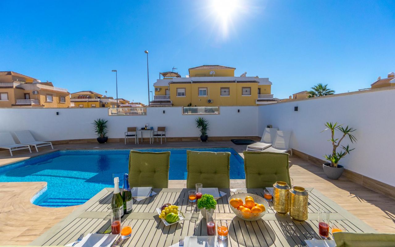 La parcelle, entièrement carrelée, propose différents espaces pour se détendre. Sa cuisine d’été est parfaite pour recevoir famille et amis, et la véritable pièce maîtresse de l’extérieur est sa piscine privée, un vrai plaisir pendant les journées chaudes. La maison dispose également d’un parking sur la parcelle, d’une pergola, d’un portail automatique et d’un débaras.