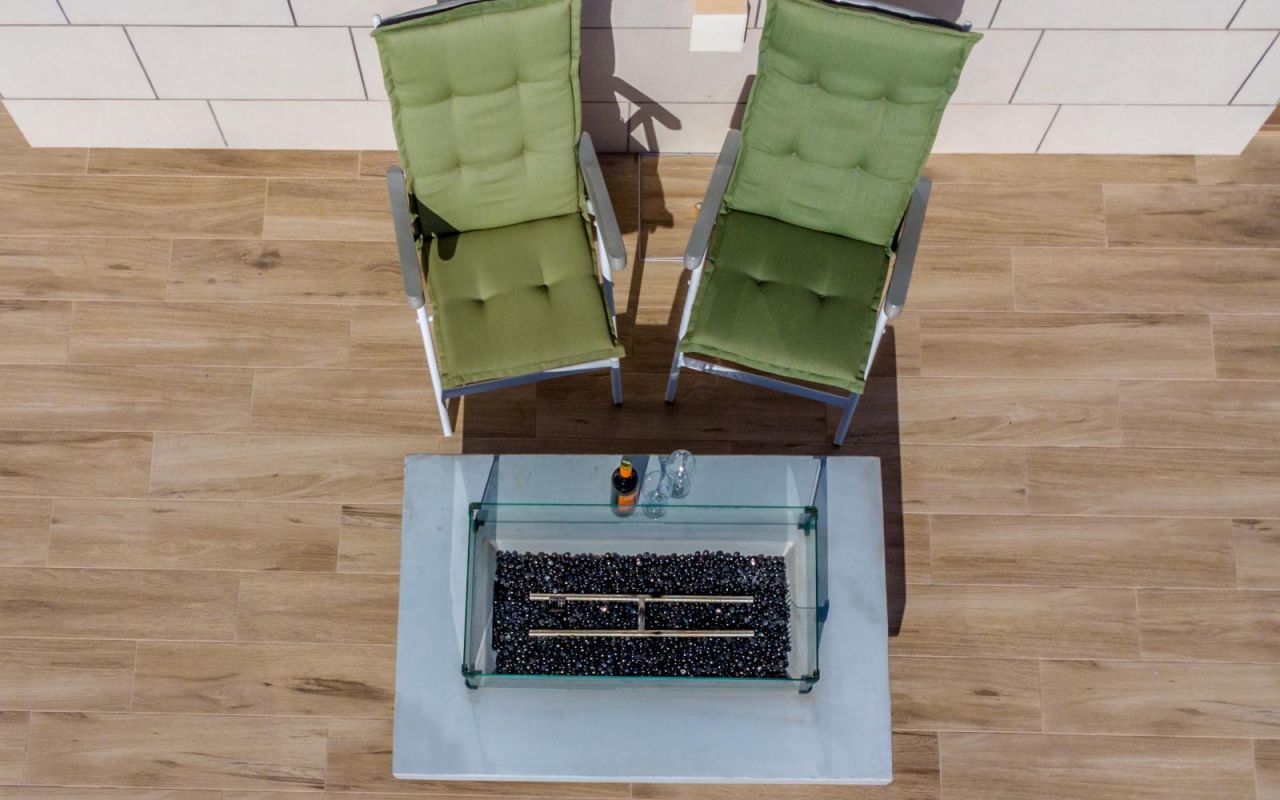 Depuis le jardin, un escalier extérieur mène à une terrasse-solarium de 100 m², entièrement aménagée, avec une seconde cuisine d’été et un barbecue — un espace idéal pour les soirées en plein air.