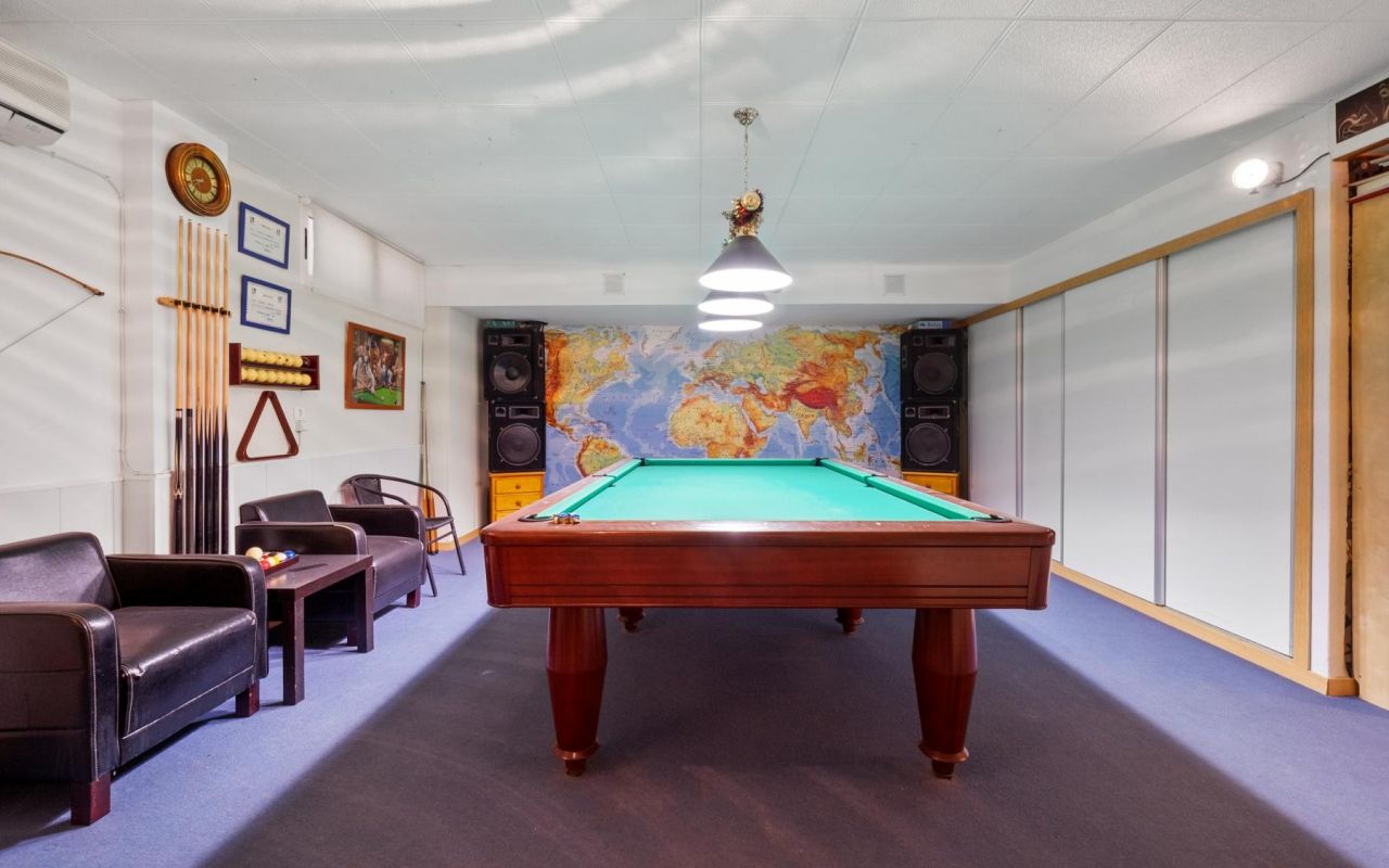 Le sous-sol propose un espace exceptionnel : un garage transformé en zone de loisirs, comprenant une grande salle de jeux avec table de billard, un espace bar et une chambre supplémentaire. Cet espace peut facilement être reconverti à son usage initial.