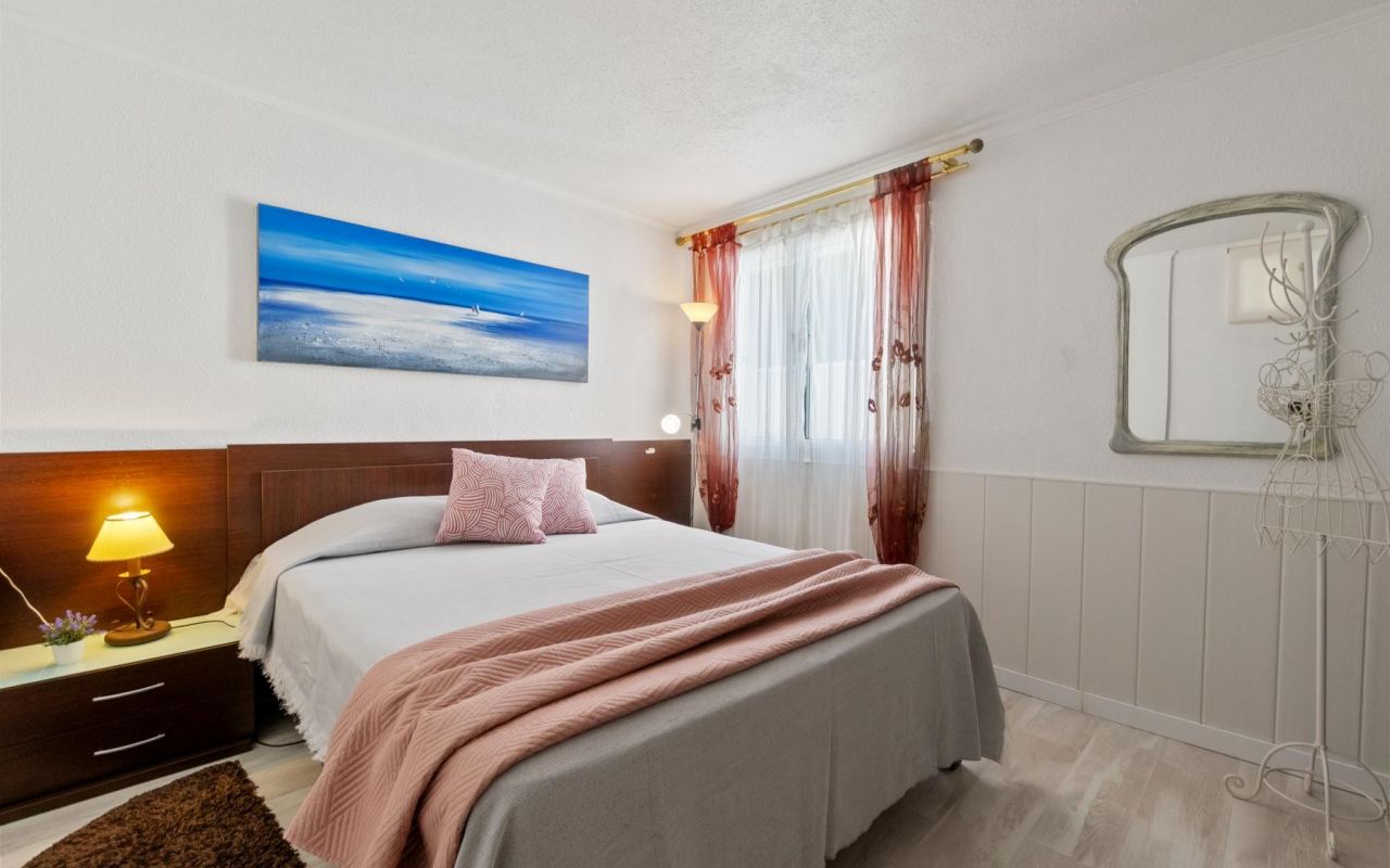 L’étage supérieur abrite deux chambres, dont l’une avec accès à une terrasse privée ensoleillée avec vue lointaine sur la mer, ainsi qu’une salle de bains complète.