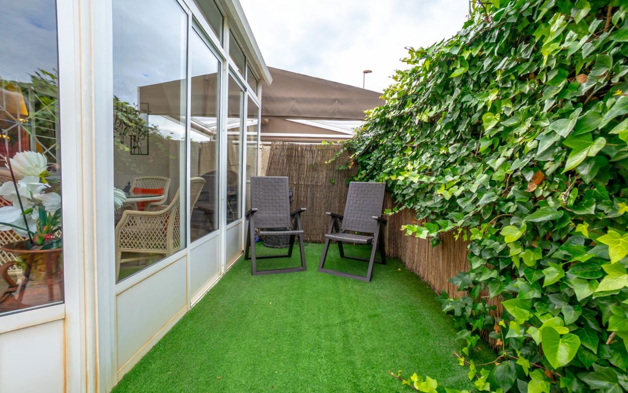 À l’avant et sur le côté gauche, la propriété dispose d’un terrain d’environ 45 m², aménagé en jardin privé, avec entrée pour véhicule et débarras.